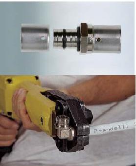 Второй тип соединений металлопластика – это пресс-фитинги. Пресс-фитинг – это неразъемное соединение, которое получается с помощью сильного обжатия специальным инструментом. Поэтому главное отличие пресс-фитинга от цангового соединения – это его надежность и то, что его можно смело убирать в стену и монолитить. Но для монтажа пресс-фитингов требуется дорогое специальное оборудование. Из-за этого вырастает окупаемость самого оборудования, что делает монтаж дороже.