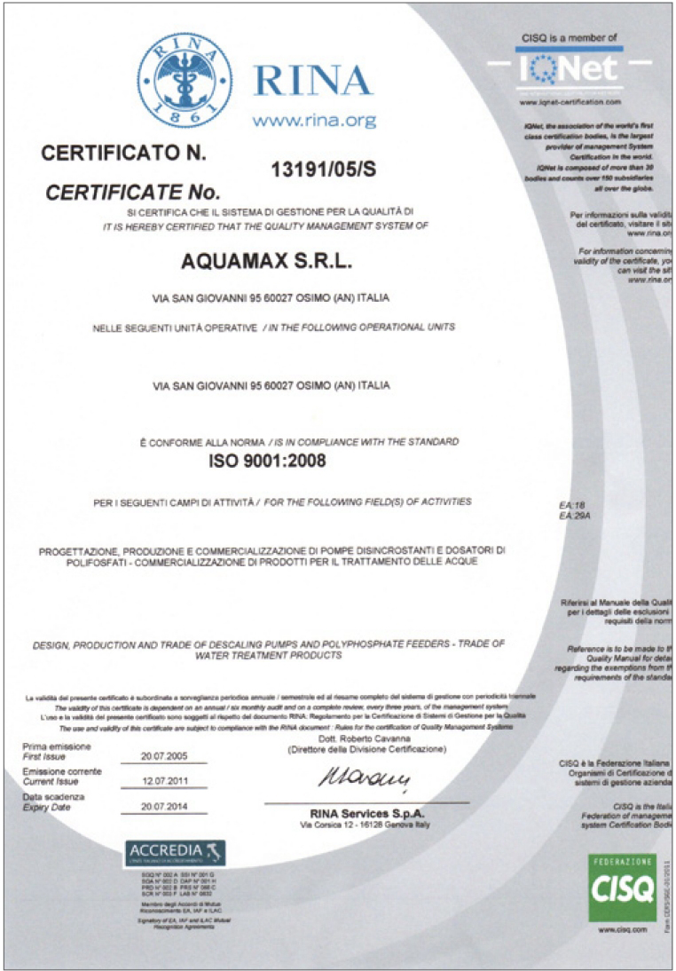 Сертификат ISO 9001:2008 Aquamax S.R.L. (Италия)  СКАЧАТЬ