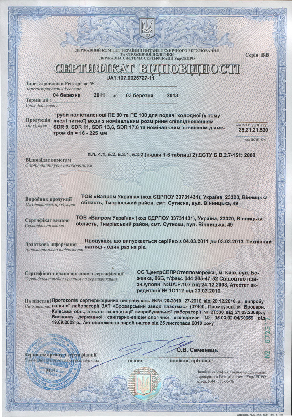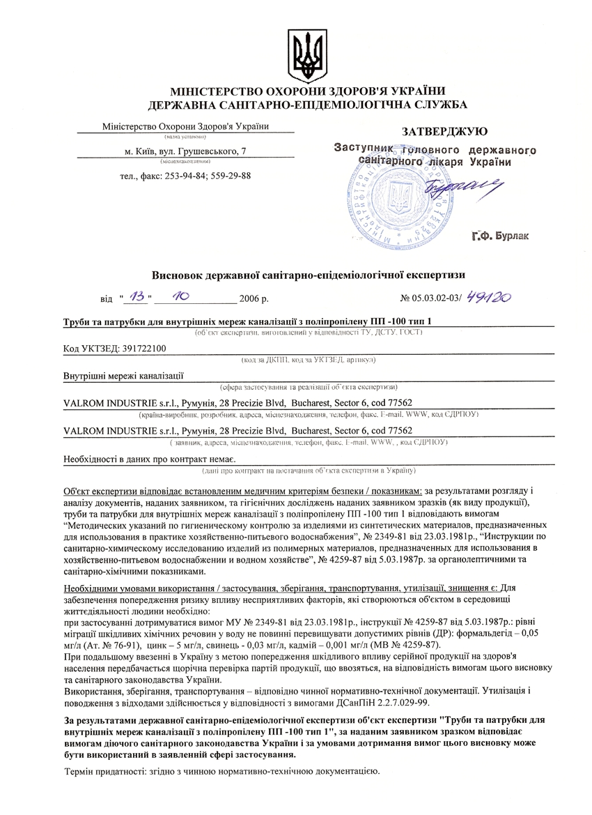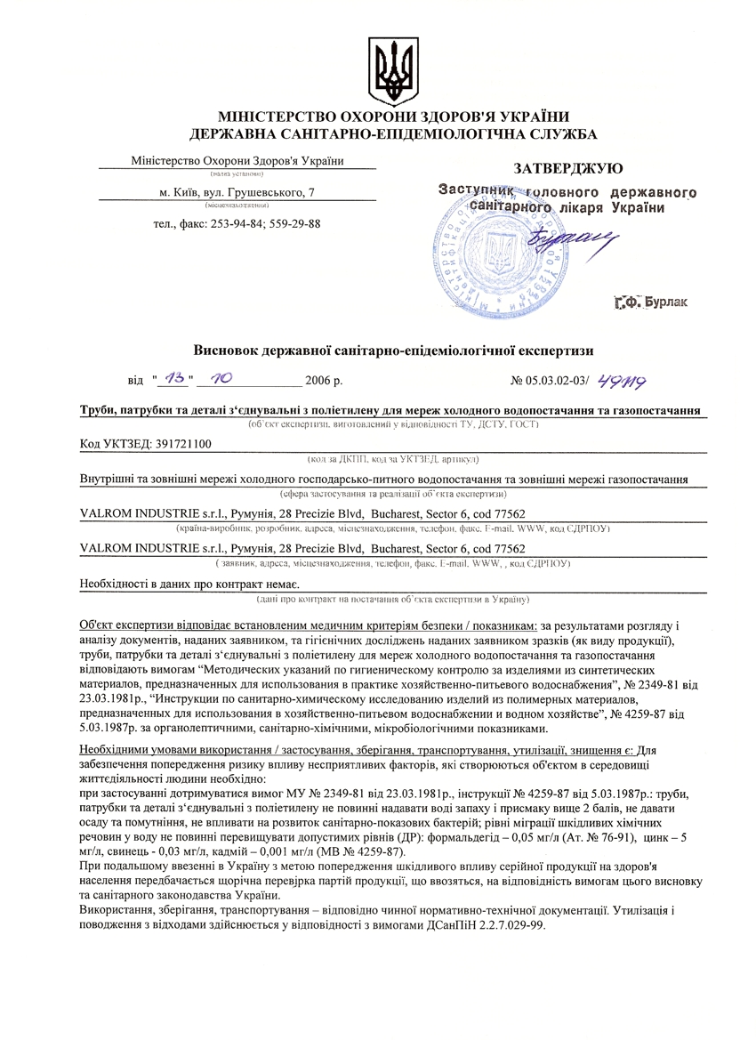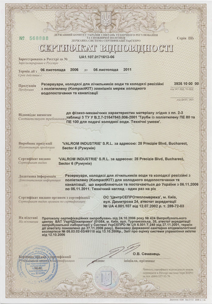 Сертификат на резервуары, колодцы Valrom Industrie S.r.l. (Румыния) СКАЧАТЬ Сертификат на трубы полиэтиленовые ПЕ 80, ПЕ 100 Валром Украина (Украина) СКАЧАТЬ Гигиен. заключение на трубы, детали соед. из ПЭ Valrom Industrie S.r.l. (Румыния) лист1 СКАЧАТЬ Гигиен. заключение на трубы, детали соед. из ПЭ Valrom Industrie S.r.l. (Румыния) лист2 СКАЧАТЬ Гигиен. заключение на трубы и патрубки из ПП -100 тип 1 Valrom Industrie S.r.l. (Румыния) СКАЧАТЬ