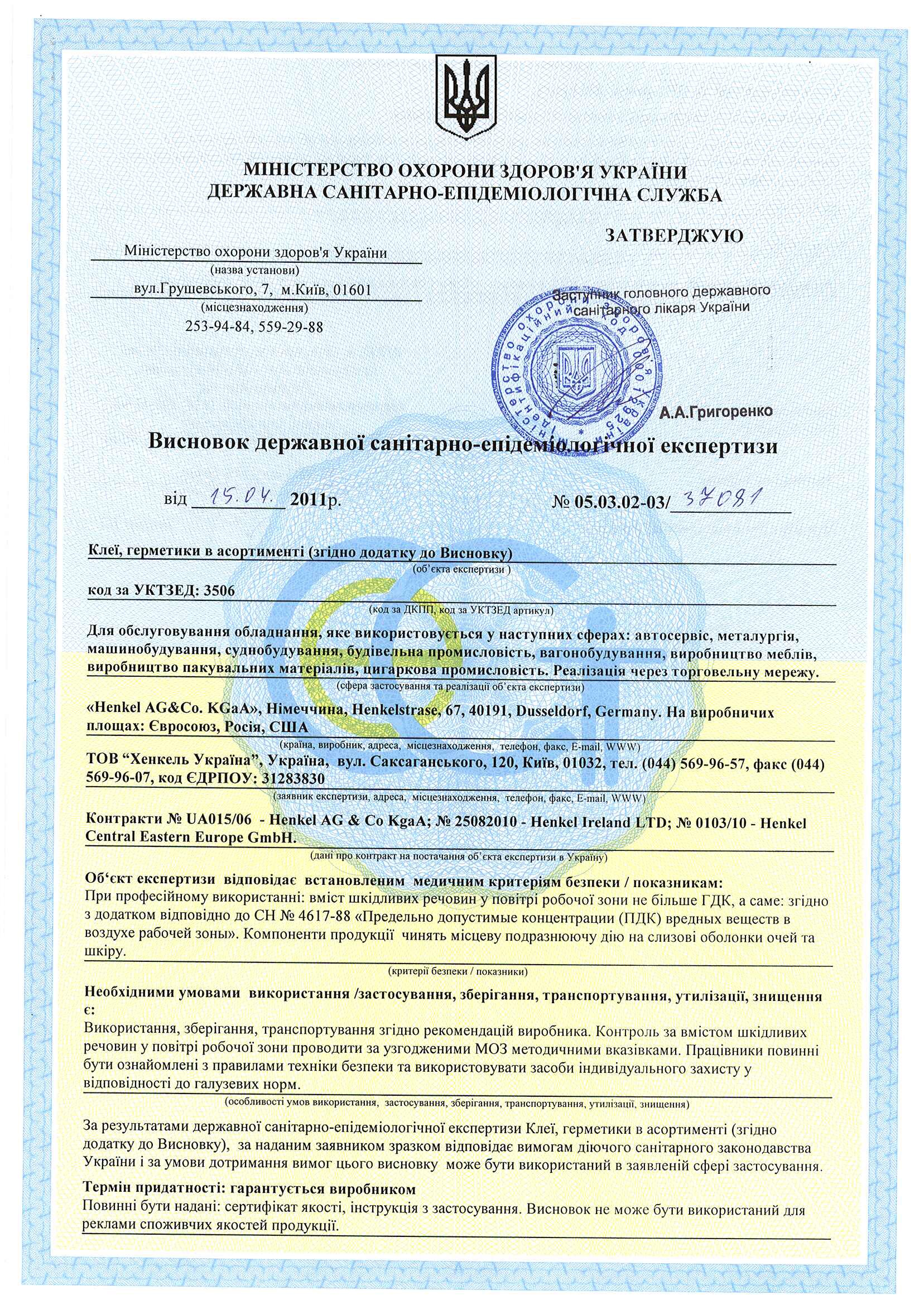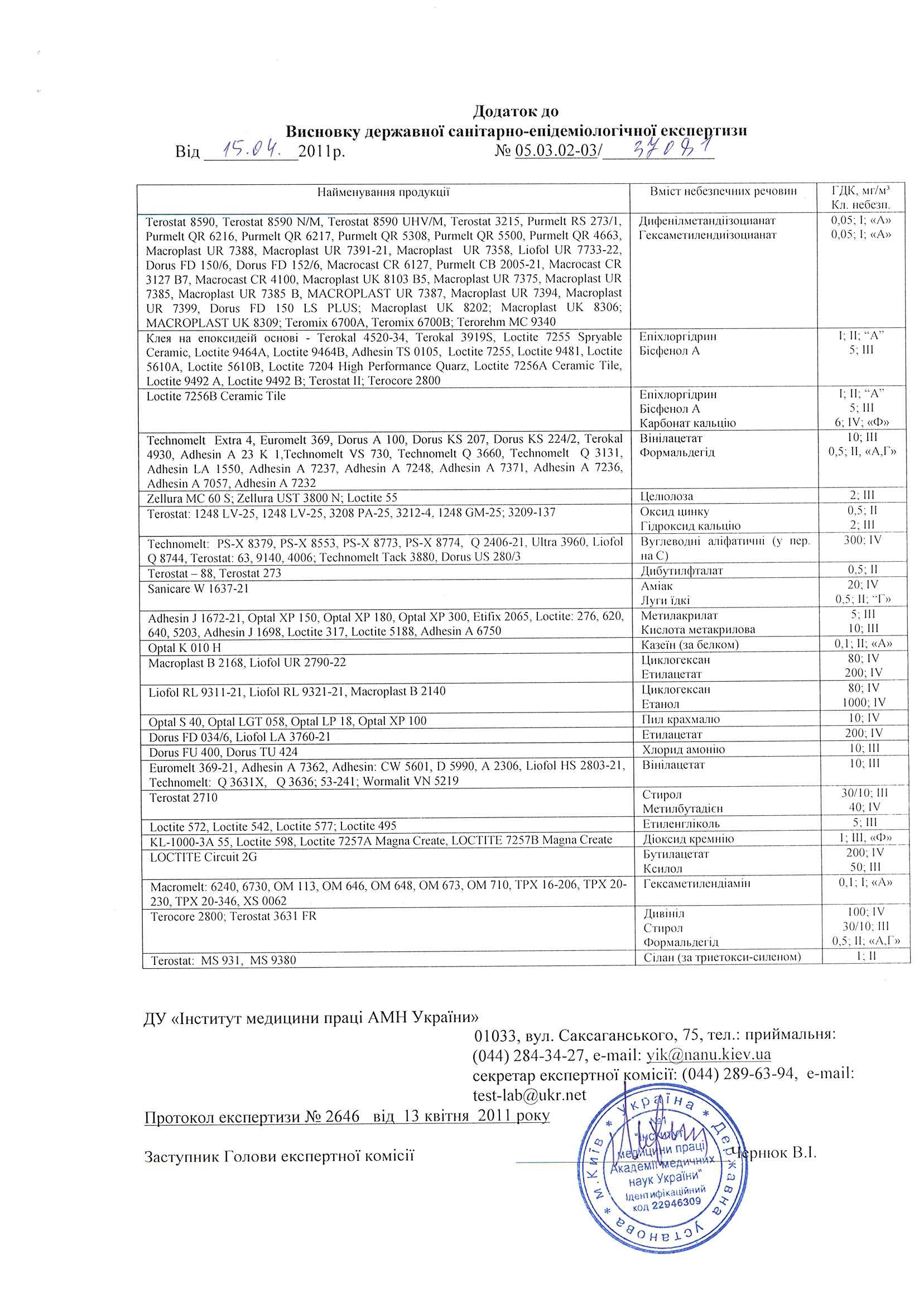 Гигиен. заключение на клеи, герметики Henkel AG&CO.KGaA (Германия) лист1 СКАЧАТЬ Гигиен. заключение на клеи, герметики Henkel AG&CO.KGaA (Германия) лист2 СКАЧАТЬ Приложение к гигиен. заключению на клеи, герметики Henkel AG&CO.KGaA (Германия) СКАЧАТЬ
