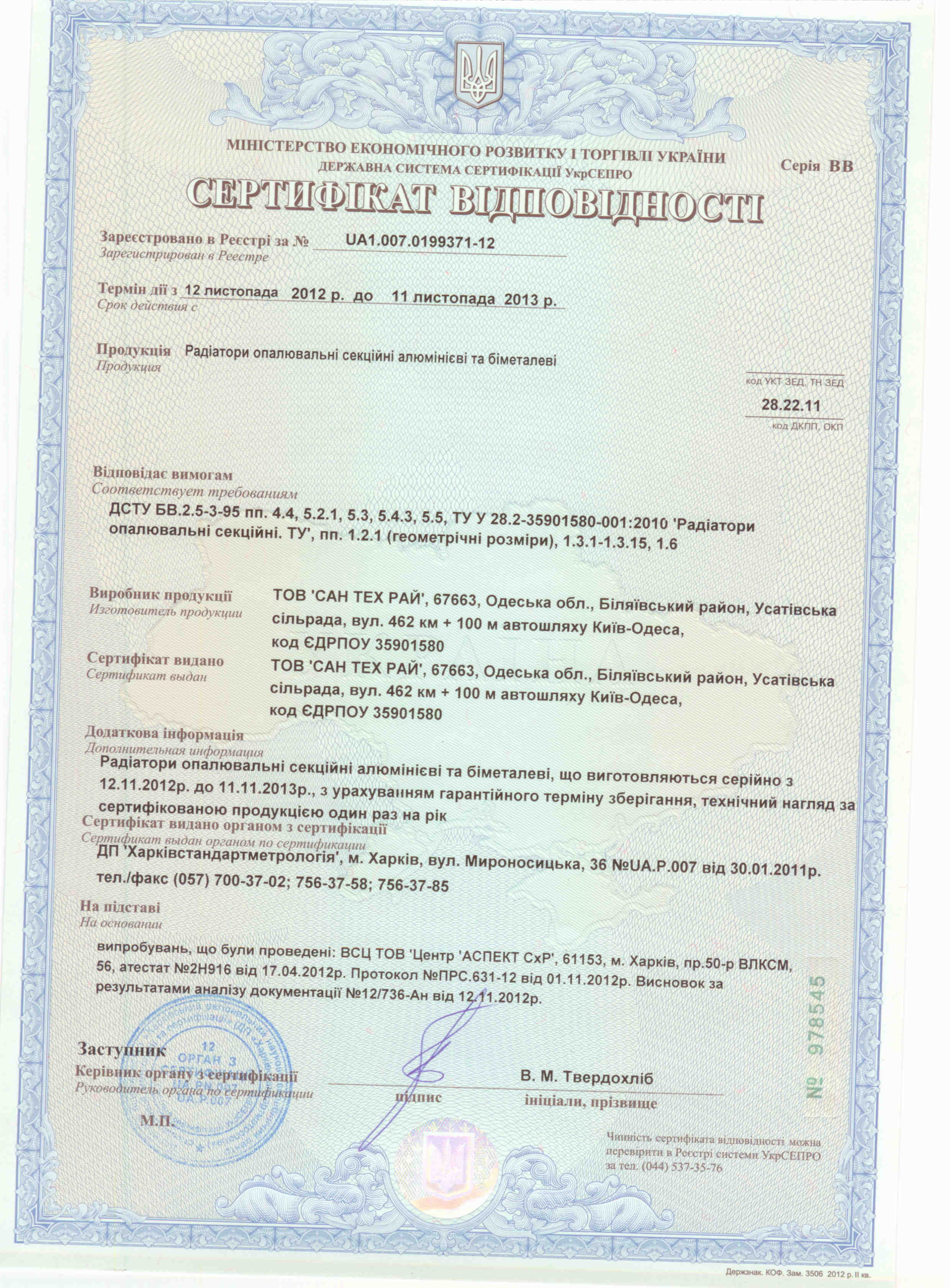 Сертификат на радиаторы алюминиевые, биметаллические СанТехРай (Украина)  Скачать