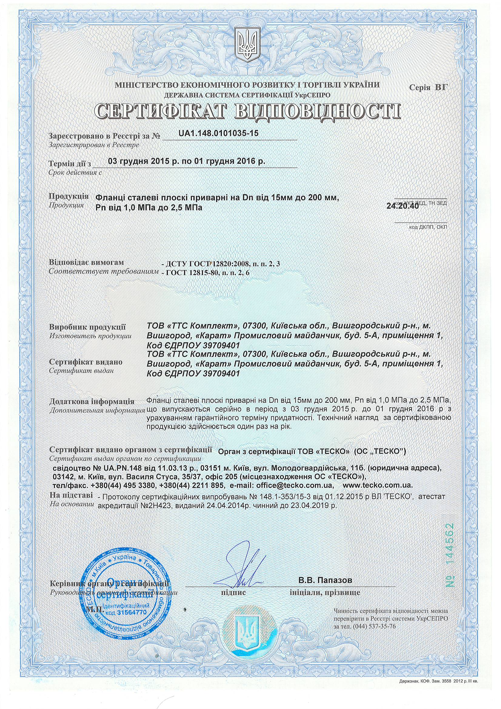 Сертификат на фланцы стальные плоские приварные ТТС Комплект (Украина)СКАЧАТЬ
