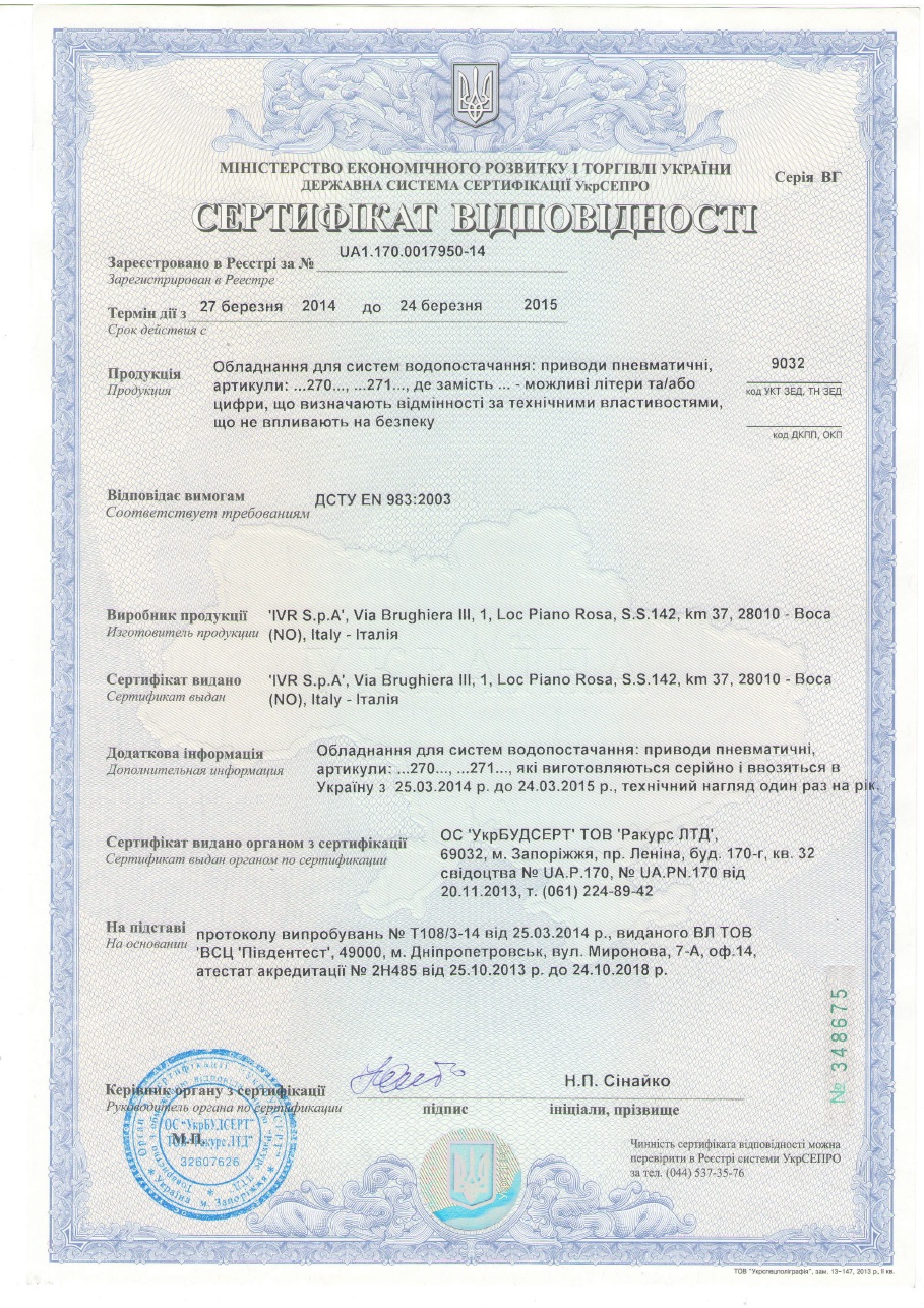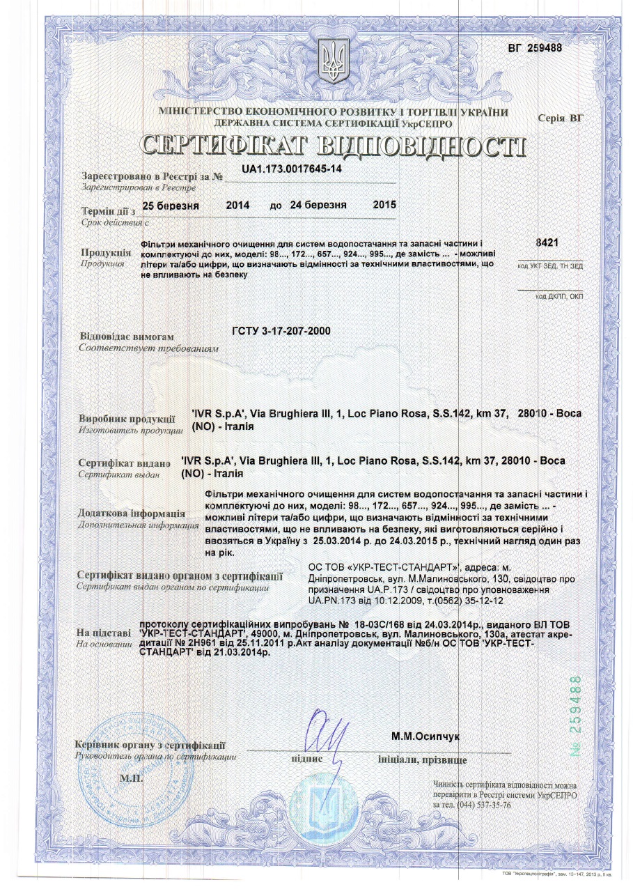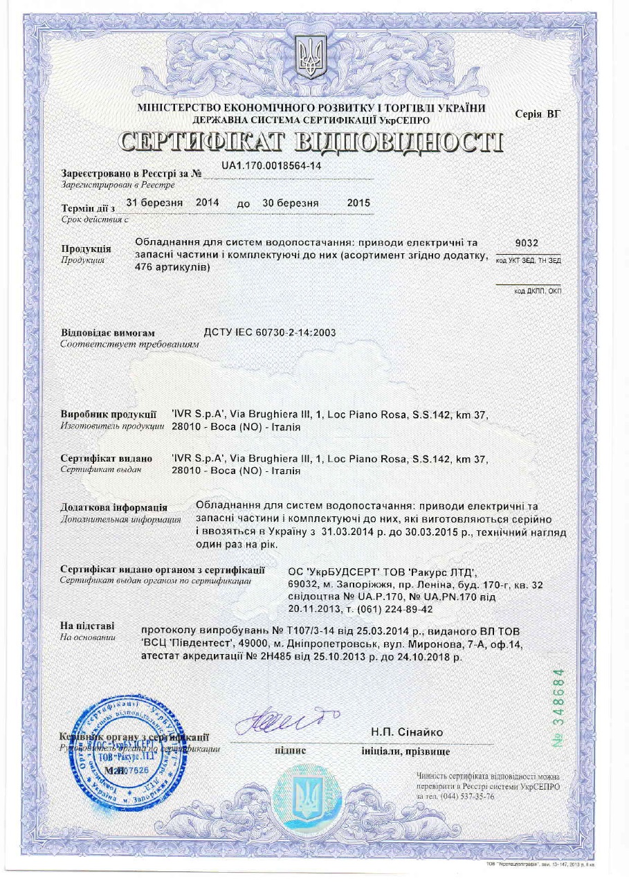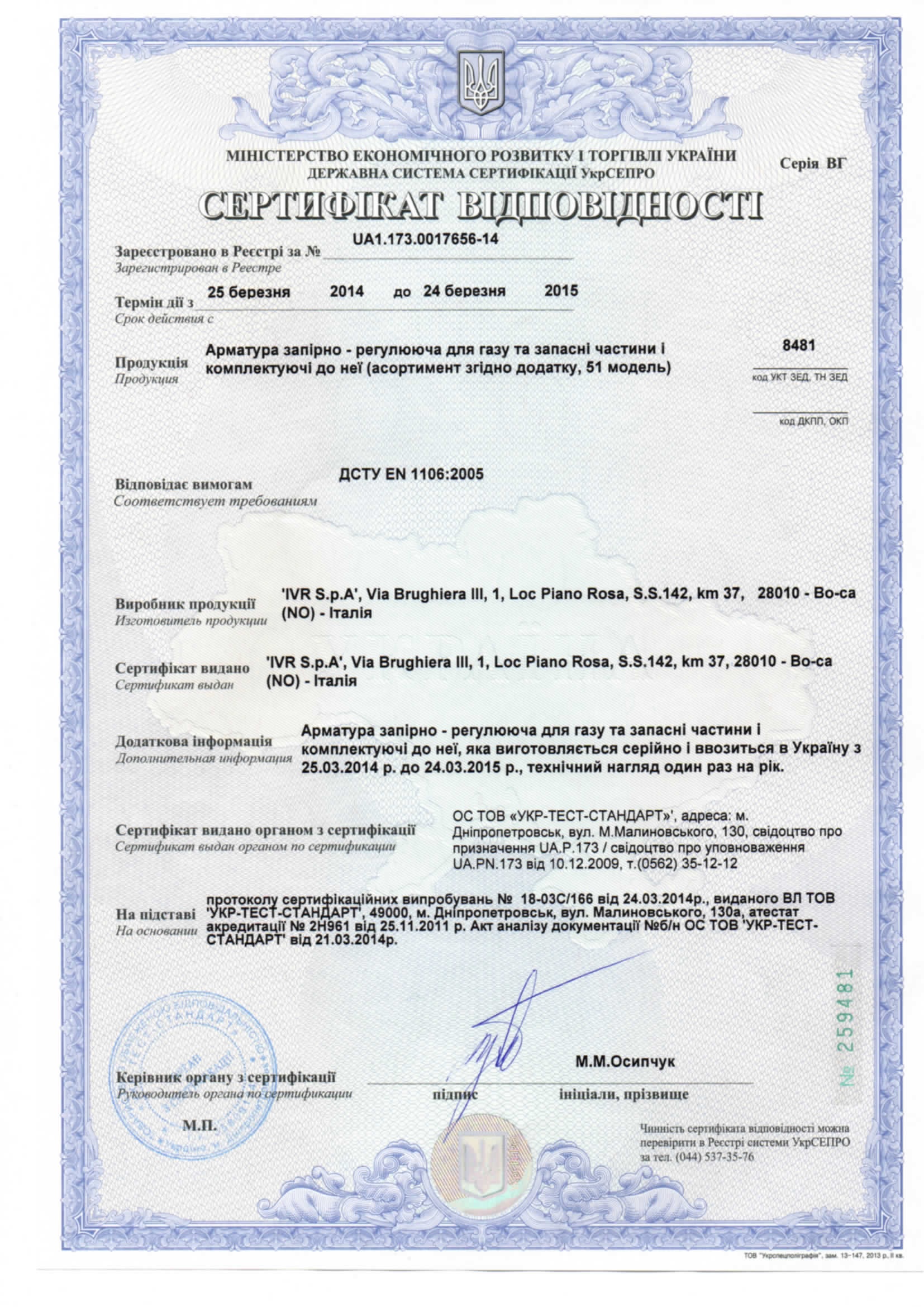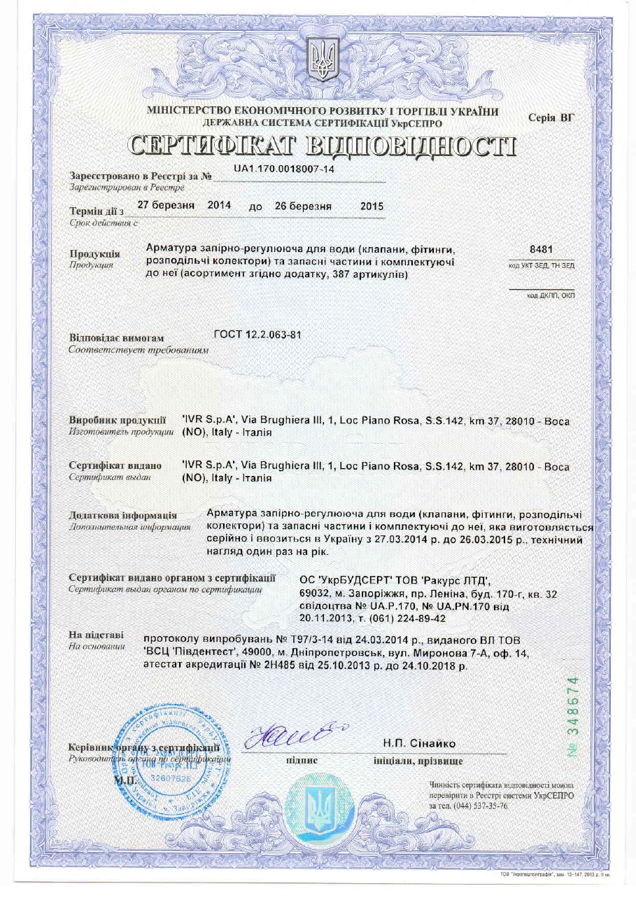 Сертификат на арматуру запорно-регулирующую IVR S.p.A (Италия)СКАЧАТЬ Приложение к Сертификату на арматуру запорно-регулирующую IVR S.p.A (Италия) СКАЧАТЬ Сертификат на пневмоприводы IVR S.p.A (Италия) СКАЧАТЬ Сертификат на арматуру запорно-регулирующую для газа IVR S.p.A (Италия) СКАЧАТЬ Приложение к Сертификату на арматуру запорно-регулирующую для газа IVR S.p.A (Италия) СКАЧАТЬ Сертификат на фильтры для воды IVR S.p.A (Италия) СКАЧАТЬ Сертификат на электроприводы IVR S.p.A (Италия) СКАЧАТЬ Приложение к Сертификату на электроприводы IVR S.p.A (Италия) СКАЧАТЬ