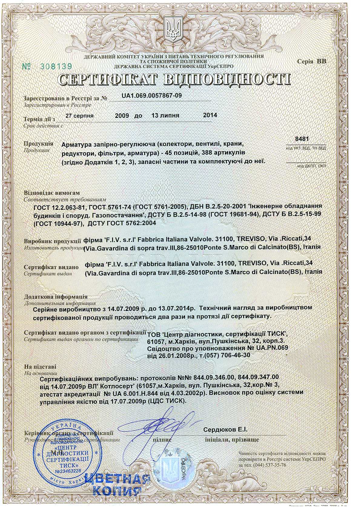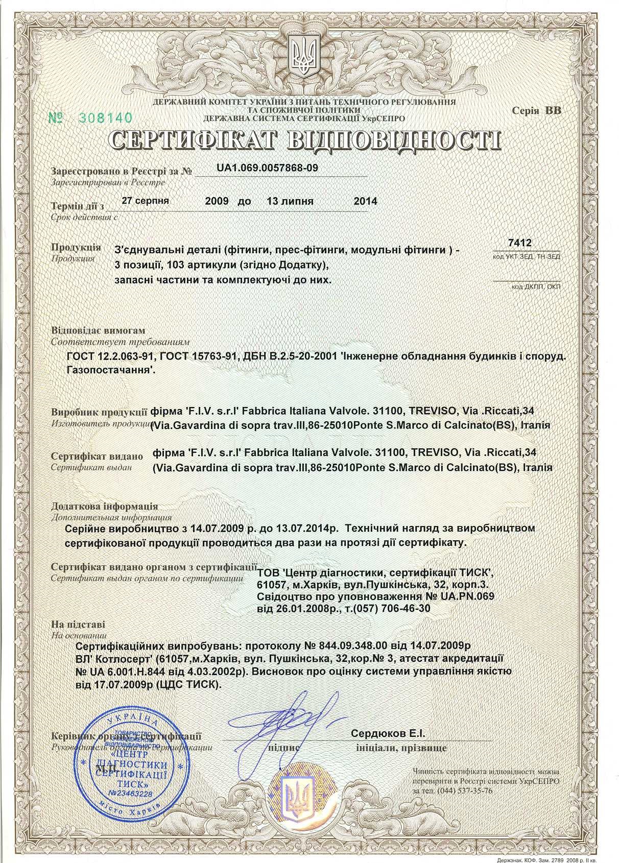 Сертификат на соединительные детали, резьбовые и прессовы фитинги F.I.V. s.r.l. (Италия)СКАЧАТЬ Сертификат на арматуру запорно-регулирующую F.I.V. s.r.l. (Италия)СКАЧАТЬ Сертификат на трубы металлоплаcтиковые PE-X/AL/PE-X F.I.V. s.r.l. (Италия) СКАЧАТЬ