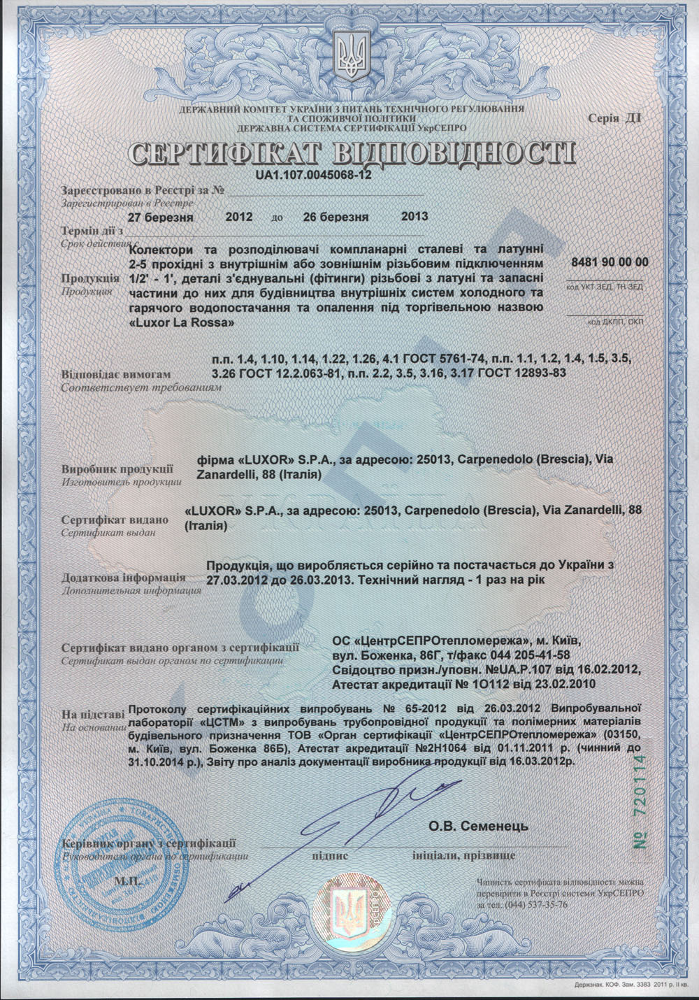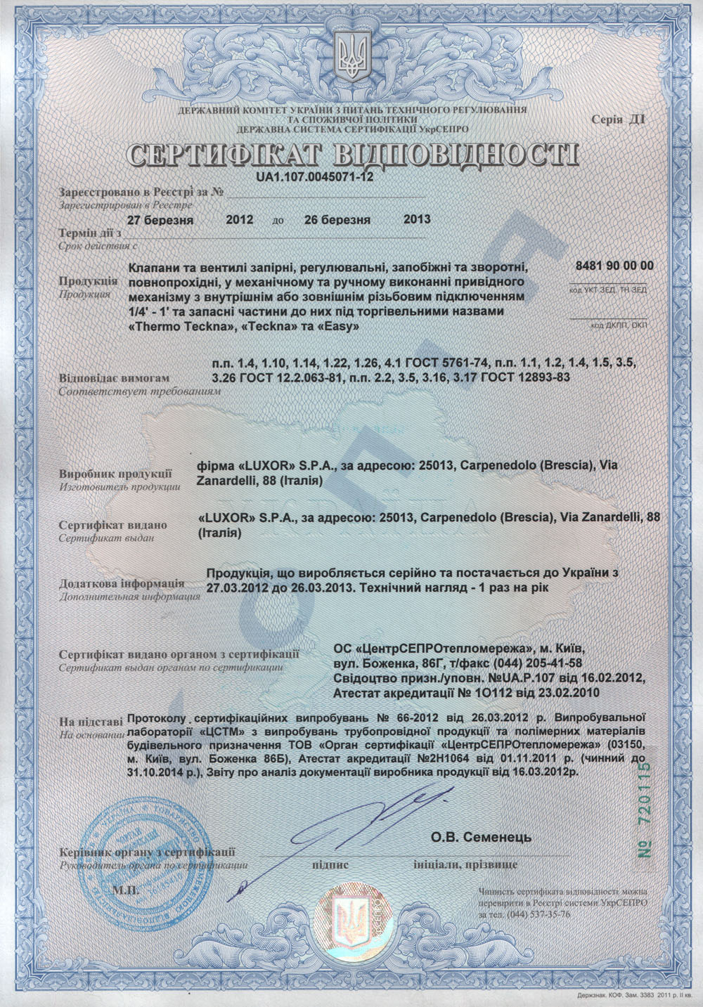 Сертификат на коллекторы и фитинги резьбовые Luxor S.P.A. (Италия)СКАЧАТЬ Сертификат на вентили запорные, клапана Luxor S.P.A. (Италия)СКАЧАТЬ